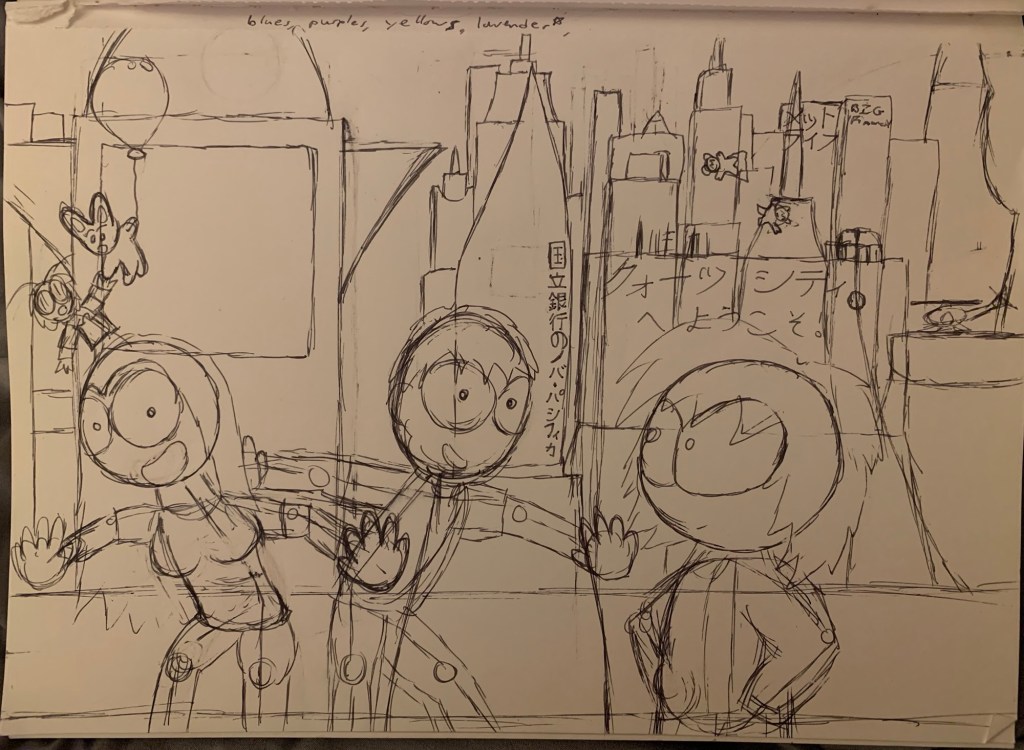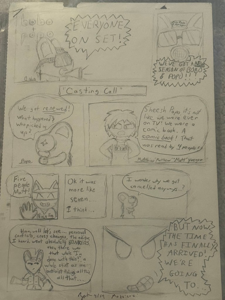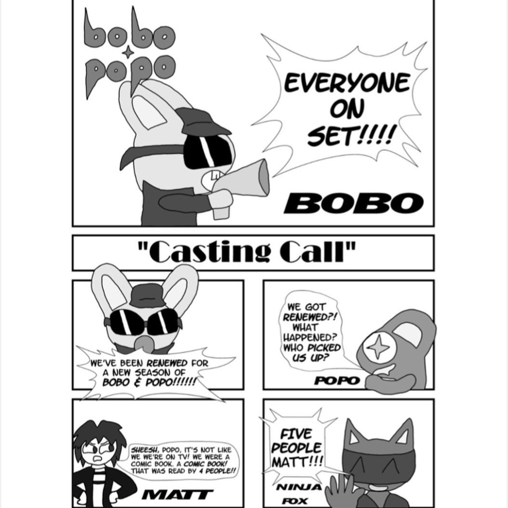 In 2016, the idea for a reboot came about. Now in Portland, Oregon, Zach drew up some concepts and typed up a few scripts to begin a professional launch for Bobo & Popo. Seeing the need to whittle the cast down to a few main characters, the idea was chosen for the reboot to be tongue-in-cheek story about the characters rebooting their own series. Called “Casting Call”, this was Zach’s first use of the Clip Studio comic software and was completed around 2018, around the time he restarted his education.