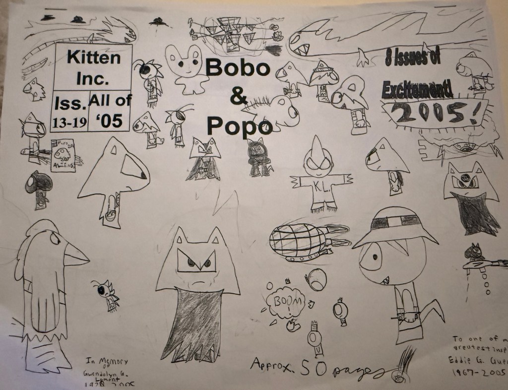 Despite making its debut in the 2020’s, Bobo & Popo can trace its origins to a humble comic Zach made while attending Hayes Middle School in Albuquerque, NM. Characters such as Bobo, Popo, Lizard, and Ninja Fox first appeared when the comic debuted in 2003. Encouraged by his seventh-grade English teacher, Sally Voorheis, the comic was limited to friends, family and a brief cameo in the school newsletter in 2004. As Zach got older more mature concepts and ideas began to take shape and the comic went into hiatus, officially ending in 2006. Although tongue-in-cheek references are made to the original series, the 2003 version is considered non-canonical to the rebooted series, though old stories may be retold or repurposed for the current canon.